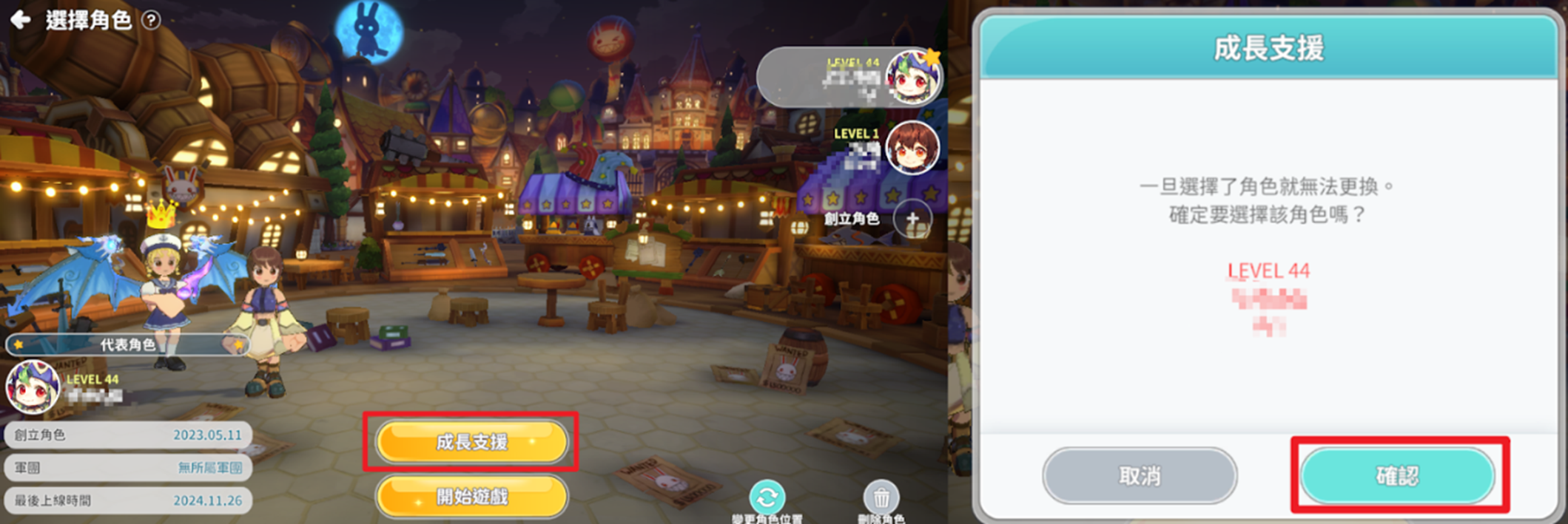 1.開始遊戲後在角色選擇畫面中選擇190級以下的角色,點選【成長支援】按鈕即可繼續遊戲。