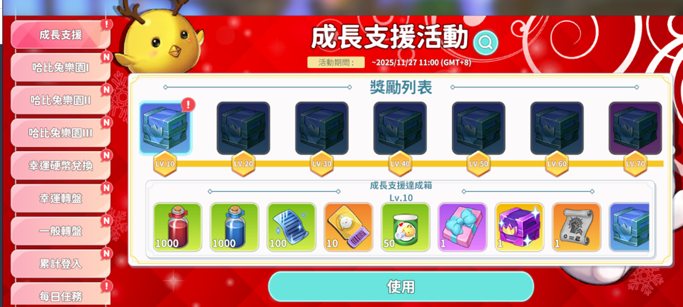 2.達指定等級後,可至活動頁面點選領取對應等級的「成長支援達成箱」,獎勵將直接發送至您的信箱中。