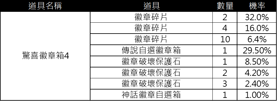 機率表 (驚喜時裝/配件/徽章 隨機箱)