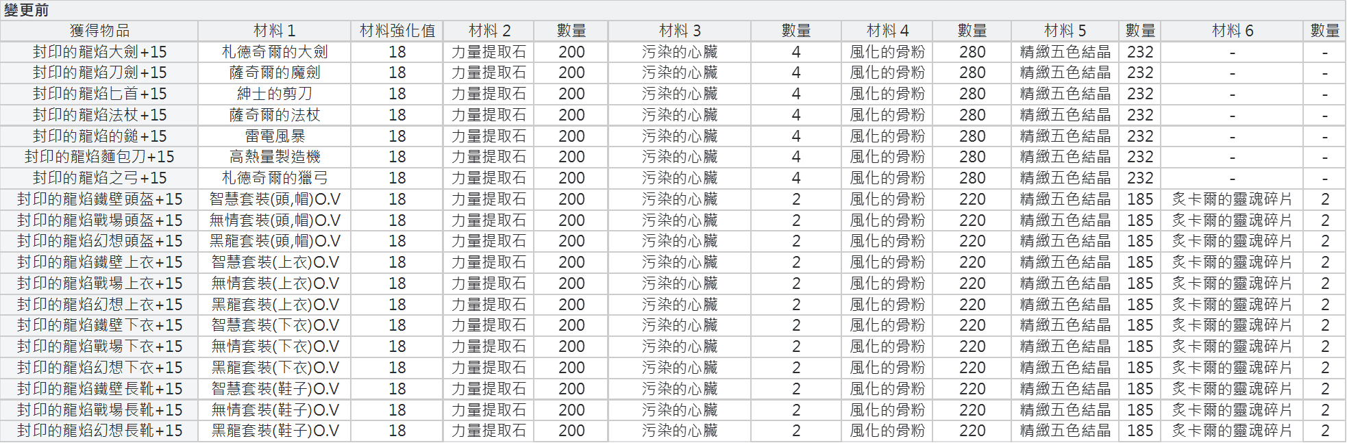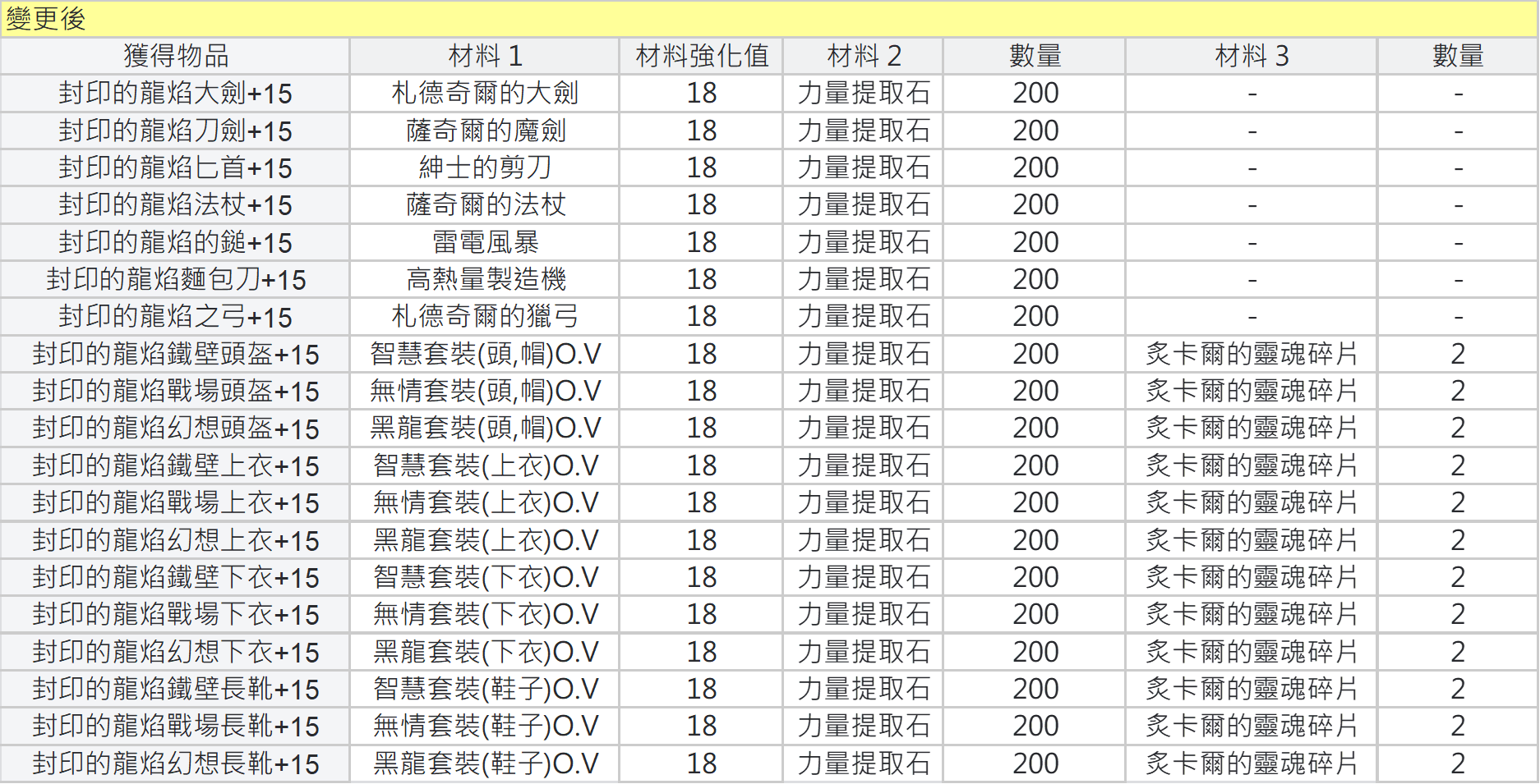 但更新後,強化製作所需的材料將進行以下簡化調整。